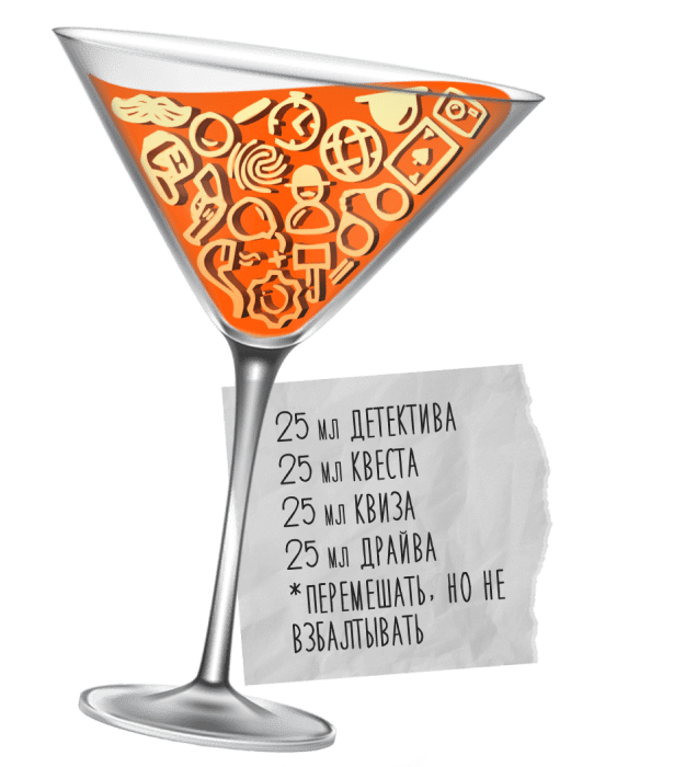 Мы предлагаем всем любителям пощекотать себе нервы погрузиться в мир расследований, тайн и интриг. «Коктейль Пуаро» — оригинальная многоформатная игра, сочетающая в себе элементы детектива, квеста в реальности и классического квиза, где каждый раунд бросит вашей команде вызов. Наш коктейль позволит испытать новые ощущения от игры в баре, проверяя вашу логику, дедуктивные способности и готовность вашей команды сплотиться в решающий момент